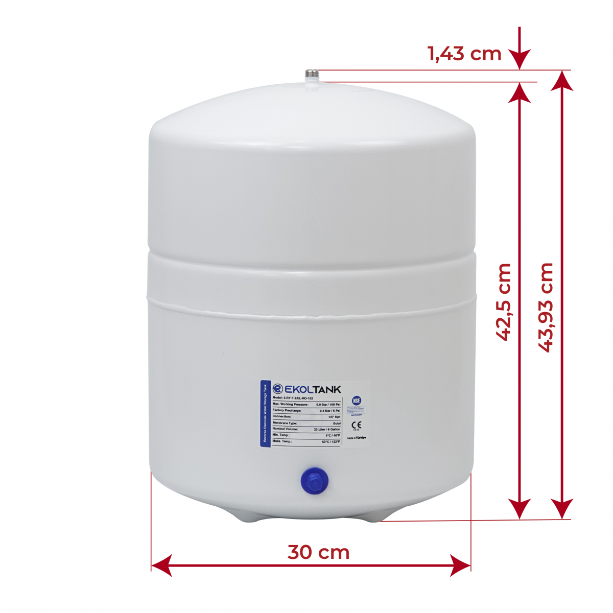 Ekol Metal Tank RO-152 offers a reliable and efficient storage solution for water purification systems with its high-capacity design. With a capacity of 6 gallons (23 liters), it is designed to comfortably meet your daily drinking and usage water needs.
